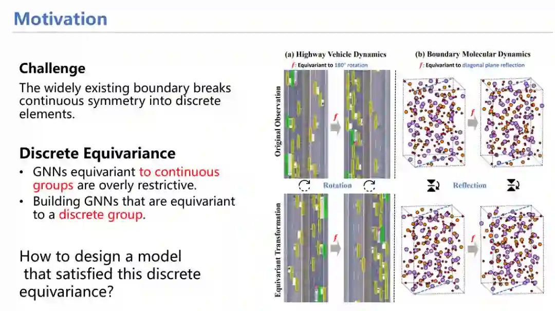 几何深度学习的等变性约束已经广为人知,并应用到各个领域。然而,对所有系统都加以等变性约束是否太过严格?例如,高速公路上的汽车永远不会跑出路,因此它的等变性只体现在旋转180度后有效。因此,有必要探究在不同的离散等变群上适当放松等变性约束,是否更为合理?