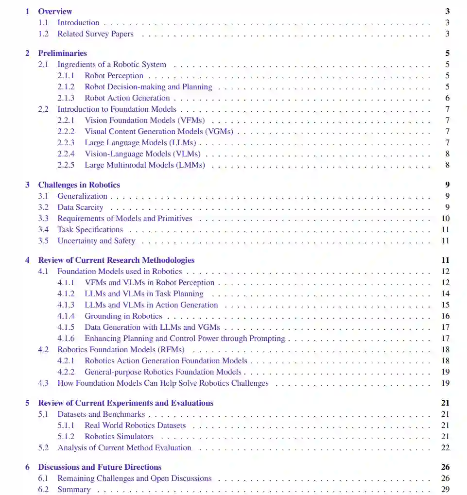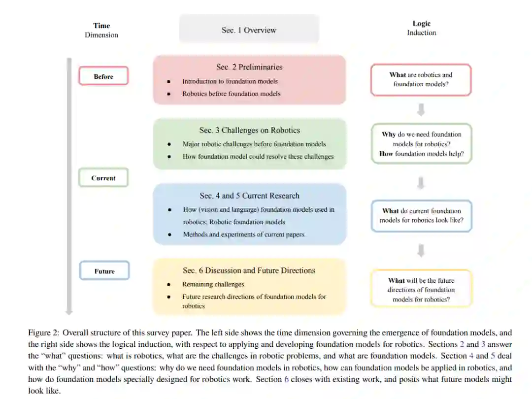 本文的主要组成部分在图1中进行了总结。本文的整体结构如图2所述。在第2节中,我们简要介绍了基础模型时代之前的机器人研究,并讨论了基础模型的基础知识。在第3节中,我们列举了机器人研究中的挑战,并讨论了基础模型可能如何缓解这些挑战。在第4节中,我们总结了机器人技术中基础模型的当前研究现状。最后,在第6节中,我们提出了可能对这一研究交叉领域产生重大影响的潜在研究方向。