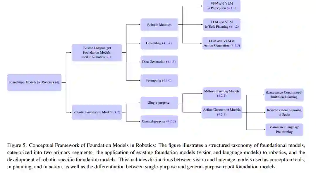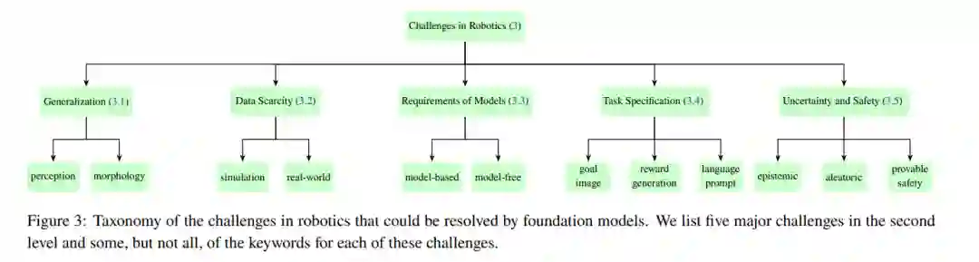 对于机器人感知,泛化能力和模型的挑战是相互联系的,因为,如果感知模型已经具有非常好的泛化能力,那么就没有必要为了领域适应或额外的微调而获取更多数据。此外,解决安全挑战的呼声在很大程度上缺失,我们将在第6节中讨论这个特殊问题。用于泛化的基础模型 零次泛化是当前基础模型的最显著特征之一。机器人技术几乎在所有方面和模块都受益于基础模型的泛化能力。首先,VLM和VFM作为默认的机器人感知模型在感知方面的泛化能力是一个很好的选择。第二方面是任务级规划的泛化能力,由LLMs[24]生成任务计划的细节。第三个方面是运动规划和控制方面的泛化能力,通过利用RFMs的力量。