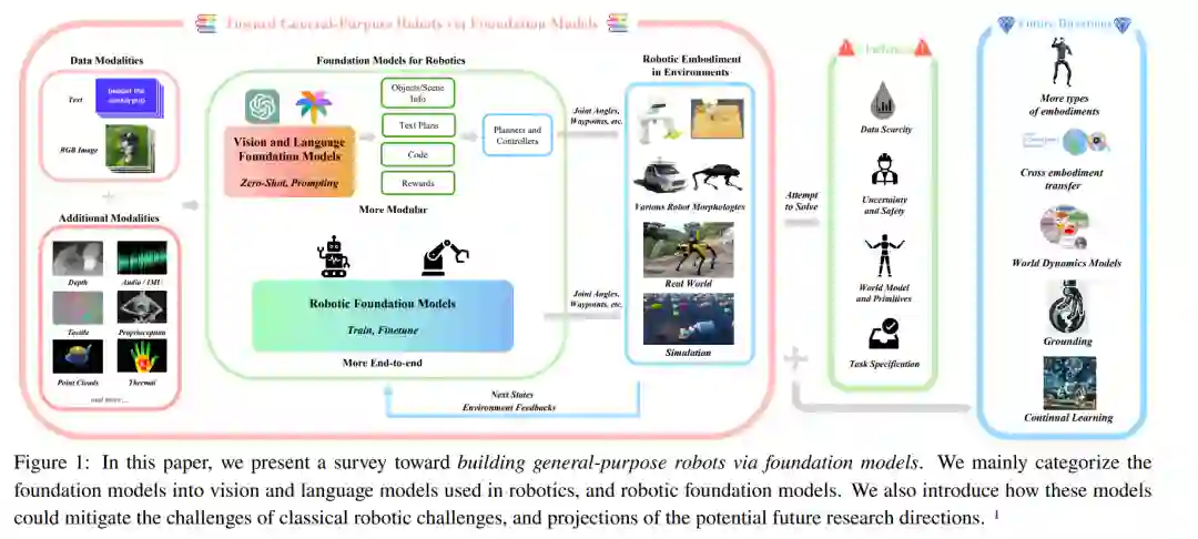 在构建具有泛化能力的机器人系统所面临的挑战的同时,我们也注意到自然语言处理(NLP)和计算机视觉(CV)领域的显著进步——引入了大型语言模型(LLMs)[17]用于NLP,使用扩散模型进行高保真图像生成[18, 19],以及使用大容量视觉模型和视觉语言模型(VLMs)实现CV任务的零次/少次学习泛化[20-22]。这些被称为“基础模型”[23],或简称为大型预训练模型(LPTMS),这些大容量视觉和语言模型也已应用于机器人技术领域[24-26],有潜力赋予机器人系统开放世界的感知、任务规划甚至运动控制能力。除了直接应用现有的视觉和/或语言基础模型于机器人任务之外,我们也看到了开发更多针对机器人的特定模型的相当潜力,例如用于操控的动作模型[27, 28]或用于导航的运动规划模型[29]。这些机器人基础模型在不同任务甚至不同实体上显示出了极大的泛化能力。视觉/语言基础模型也已直接应用于机器人任务[30, 31],显示了将不同机器人模块融合为单一统一模型的可能性。尽管我们看到将视觉和语言基础模型应用于机器人任务以及开发新的机器人基础模型的有前景的应用,但许多机器人技术的挑战仍然难以企及。从实际部署的角度来看,模型通常无法复制,缺乏多实体泛化能力,或者无法准确捕捉环境中可行(或可接受)的情况。此外,大多数出版物利用基于Transformer的架构,专注于物体和场景的语义感知、任务级规划或控制[28];其他可能受益于跨领域泛化能力的机器人系统组成部分尚未被充分探索——例如,用于世界动力学的基础模型或可以进行符号推理的基础模型。最后,我们想强调需要更多大规模实际数据以及具有多样化机器人任务的高保真模拟器。