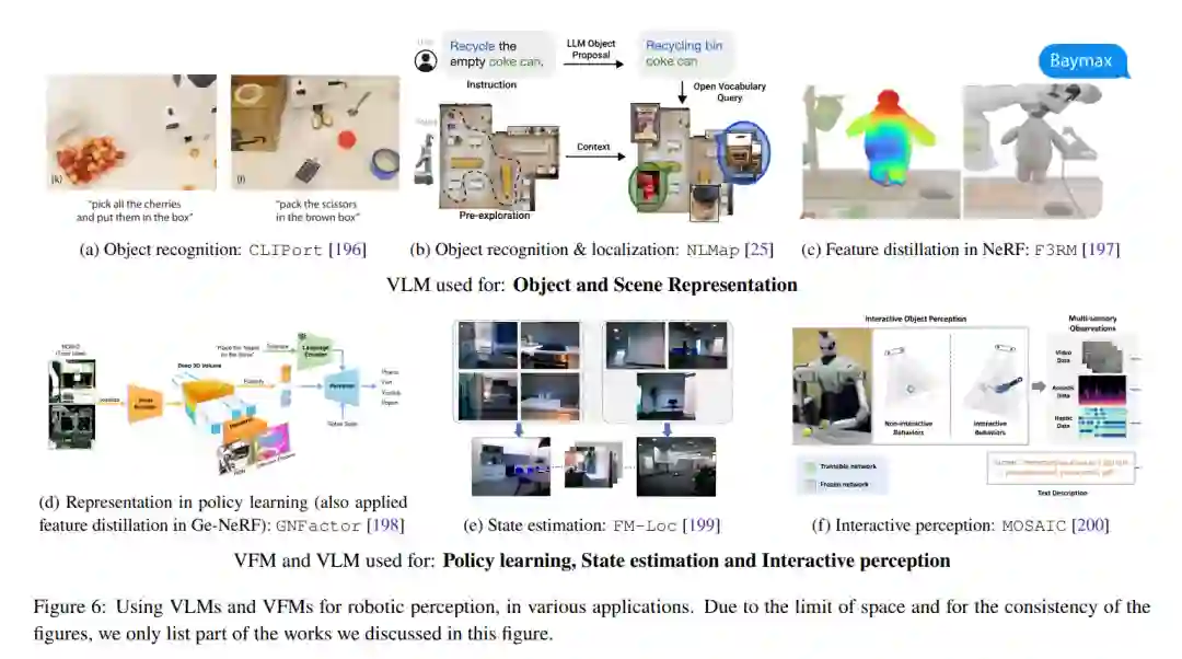 在本节中,我们重点讨论在机器人技术中零次学习应用视觉和语言基础模型。这主要包括用于机器人感知的VLMs的零样本学习部署,在任务级别和运动级别规划以及动作生成方面的LLMs的情境学习。我们在图6中展示了一些代表性的工作。