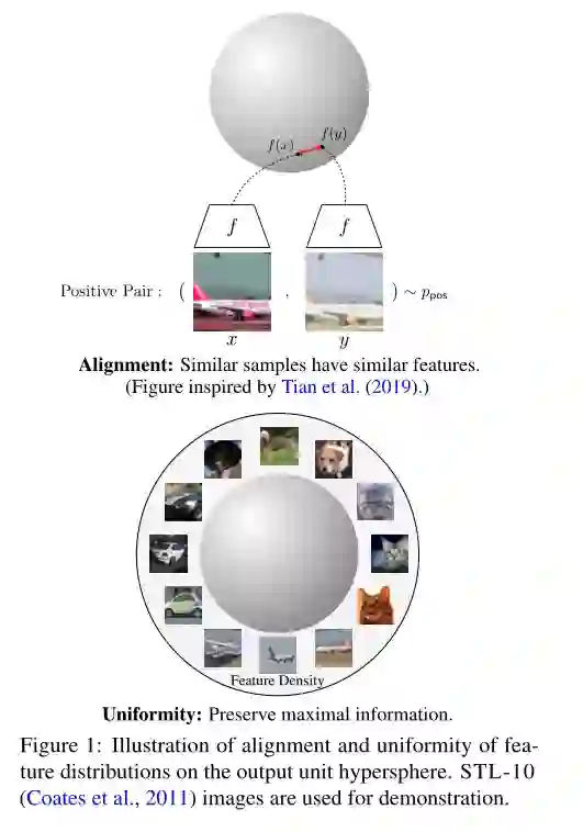 摘要:对比表示学习在实践中取得了显著的成功。在这项工作中,我们确定了与对比损失相关的两个关键性质:(1)正对特征的对齐方式(紧密度)和(2)超球面上(归一化)特征诱导分布的均匀性。我们证明,渐近地,对比损失优化了这些属性,并分析了它们对下游任务的积极影响。根据经验,我们引入了一个可优化的指标来量化每个属性。在标准视觉和语言数据集上的大量实验证实了指标与下游任务性能之间的强烈一致性。直接针对这两个指标进行优化可以使下游任务的表现比对比学习更好或更高。