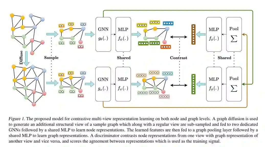 摘要:我们介绍了一种通过对比图的结构视图来学习节点级和图级表示的自监督方法。我们表明,与视觉表示学习不同的是,将视图数增加到两个以上或对比多尺度编码并不能提高性能,并且通过对比来自一阶邻居的编码和图扩散( graph diffusion)可以获得最佳性能。在线性评估协议下,我们的模型在8个节点和图分类基准上有8个取得了最新结果。例如,在CORA(节点)和Reddit-Binary(图)分类基准上,我们达到了86.8%和84.5%的准确率,比以前的技术水平分别提高了5.5%和2.4%。与监督基线相比,我们的方法在8个基准中有4个表现优于它们。