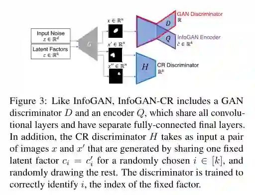 摘要:分解(disentangled)的生成模型将潜在向量映射到目标空间,同时强制学习的潜在子集是可解释的,并且与目标分布的不同属性相关联。最近的进展主要是基于变分自编码器(VAE)的方法,而训练分离的生成式对抗网络(GANS)仍然是具有挑战性的。在这项工作中,我们证明了分离的GAN面临的主要挑战可以通过使用自监督来缓解。我们的主要贡献有两个:第一,我们设计了一种新的具有自监督功能的分离GANs训练方法。我们提出了对比正则化(contrastive regularizer)算法,它的灵感来自于一个自然的分解概念:latent traversal。这比最先进的基于VAE和GAN的方法获得了更高的分离分数。其次,我们提出了一种称为ModelCentrality的无监督模型选择方案,它使用生成的合成样本来计算模型集合的medoid(多维中值推广)。令人惊讶的是,这种无监督的ModelCentrality能够选择比使用现有的监督超参数选择技术训练的模型性能更好的模型。将对比正则化和ModelCentrality相结合,在不需要有监督超参数选择的情况下,大幅度地获得了最先进的分离分数。