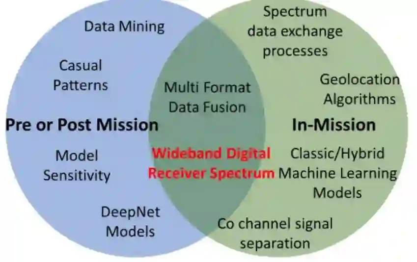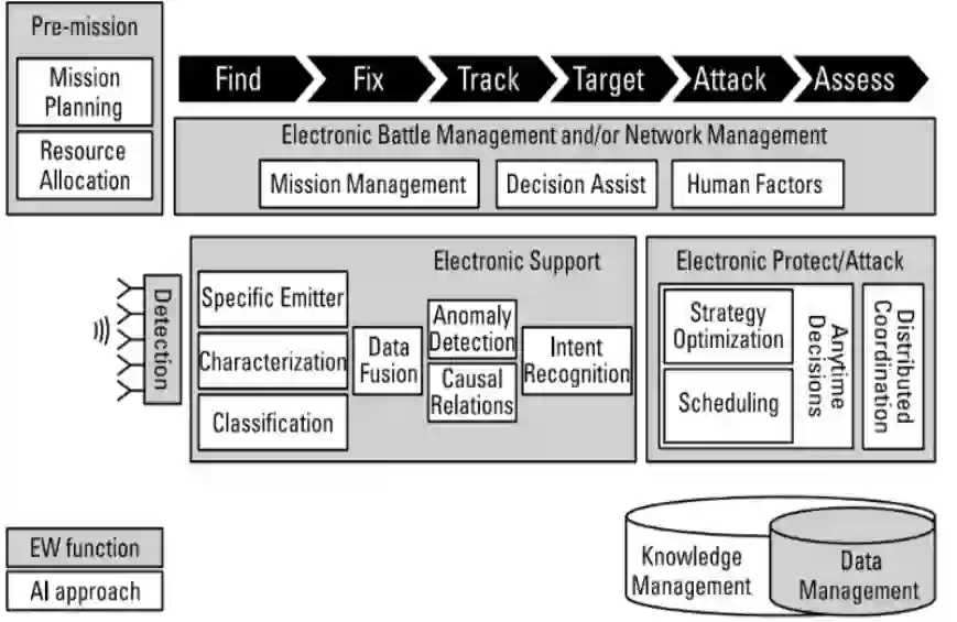 ES对环境进行分析,并创造出驱动决策者(DM)的观测数据。日益复杂的情况将频谱态势感知(SSA)定义为 "收集有关频谱使用的不同信息并处理这些信息以产生一个融合的频谱图"[15]。SSA收集、组织和处理EW所需的频谱数据。SSA必须以近实时(NRT)的方式进行,以满足任务中的决策者的需要,SSA必须结合各种支持技术,包括传统的和认知的。然而,一个挑战在于相关技术的整合和展示,其中只有少数是认知的,以减少脆性和处理新的发射器。人工智能和ML能力可以在每个层面上改善SSA,这是在其他相关SSA技术背景下对这些AI/ML技术的看法。一个完整的EW系统必须有多层面的SSA。未来的SSA系统可以用深度学习模型来生成潜在的特征,用经典的ML模型来进行任务中的更新,以及用混合模型来抵消有限的数据。此外,SSA不一定要完全依赖射频数据: 它可以与非射频数据融合,如视频和静态图像、自由空间光学、或开源、战术或作战情报。跨越多个异质来源的分布式数据融合必须创建一个在空间、时间和频率上都准确的连贯的战地频谱共同作战图。异常检测、因果推理和意图推理使作战图更加完整,以了解事件的影响并支持管理部门。