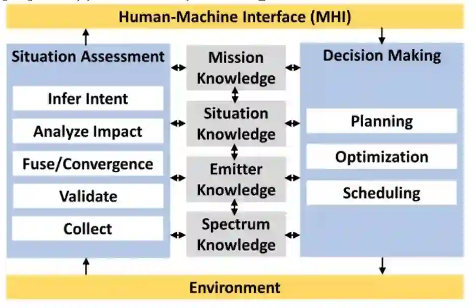 一个陆军师的基本 "有机 "通信和电子设备,在一个典型的70公里乘45公里的地区作战,是超过10,700个单独的发射器。一个支持性的空中远征部队(AEF)会带来另外1400个,而一个典型的海军航母战斗群会带来另外2400个发射器[20]。比如说: 在沙漠盾牌/沙漠风暴中,六个陆军师和一个海军陆战队师都占据了相同的地理和电磁波谱空间,还有许多其他联军和指挥控制网络[21]。鉴于这种信息密度,认知型EW也必须与人工智能概念和认知循环阶段的相关挑战相一致。