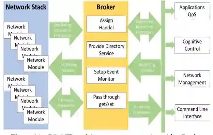 软件架构的一个例子是ADROIT。自适应动态无线电开源智能团队(ADROIT):用中间代理认知控制SDR节点之间的协作。ADROIT项目正在建立一个开源的软件定义的数据无线电,旨在由认知应用程序控制。模块暴露了它的参数和它们的属性(特别是读/写)。当一个模块发生变化时(例如,增加一个新的参数),它只需揭示新的参数,并在一个发布-订阅机制中公开参数(名称、属性),而不是为该新参数增加一个新的API函数;这也可以扩展为一个组播目的地,给后来仍需要定义的模块。ADROIT用图14所示的模块实例化了中间代理。