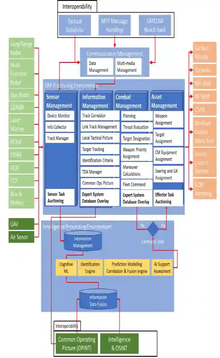 在图17中,本文展示了一个威胁发射器从EW系统进入CMS部分的顺序。从EW系统的库或数据库中识别截获的发射器;该数据库包含物理雷达特征: PRI、频率、PW、振幅、扫描类型、扫描周期平台等级和威胁名称;采集类型的特征,ECCM,如原点干扰(HOJ)Chaffs辨别,红外,双导射频和红外。如果发射物未被识别为威胁,则在本地识别的海上图像中直接代表发行者。如果被确认为威胁,它将遵循不同的路径,如前所述。导弹的获取和ECCM的类型在反应链中具有巨大的价值。如果它有HOJ能力,最好是通过C4L中捕获的特定计算直接干预硬杀伤和诱饵发射;该选定的C4L规格是由保护的洋葱头选择的,它与频谱中的感应计划一起安排。该规格将诱饵定位在C4L所确定的与发射船的一定距离和特定的β值。除了在CMS上表示威胁的到达方向外,EW系统还将C4L搜索数据和传感规范发送到多功能雷达(MFR)和火控雷达(FCR)作为即时硬杀伤系统。本文在图18中画出了由人工智能支持的战斗管理系统(CMS)的架构基础。在标准环境块中,还有四个相互关联的组件: