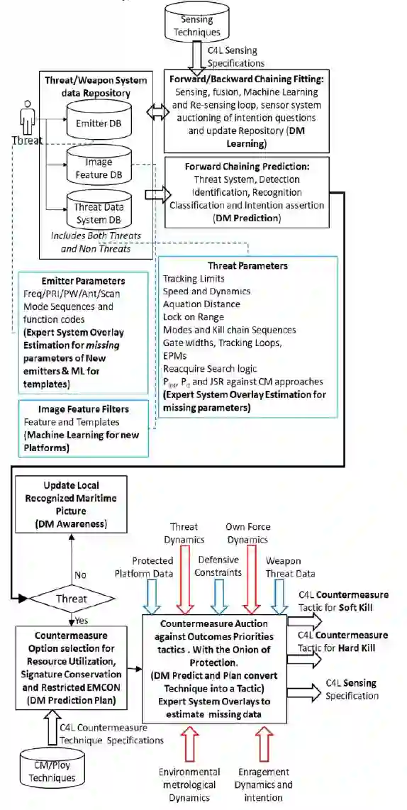 处理不同的或变化的传感器的一种可扩展的方式是,如果所有的设备可以减少不确定性或提供额外的数据来回答一个杀戮链阶段的问题,就将它们定义为传感器。因此,这些传感器可以成为拍卖算法的参与者,以其回答问题的能力来竞标。在不同的操作环境下,拍卖算法中的分数可以改变,因此,不同的传感器选择提供较低的可观察性或与当前的ROE、受限的EMCON或当前的传感器利用相一致。通过这种方式,形成了一个问答循环,完善了对情况的理解,同时在提问的基础上做出增量决定,并使环境情况有利于他们的部队使用保护洋葱的一个版本。此外,同样的拍卖优化可以与反措施一起执行,其概念是,如果一切都能影响当地的杀戮链决策或导致结论或问题发生在受害者身上,那么它就是一个影响者。由此可见,C4L提供了一种以标准形式指定反措施行动和传感规格的方法;这些规格可以一起拍卖,以便在一个可适应的模型中获得最佳效果和传感,然后该模型将优化杀戮链的进展,为跟踪的对手的杀戮链进展提供优势。在图15中,本文展示了EW系统如何在拍卖优化的基础上与具有认知DM的作战管理系统(CMS)集成。威胁的检测/识别/鉴定/分类被转移到不同的数据库中,但这些过程和数据库的不确定性导致了传感器的重新任务。这些都是拍卖,根据传感器解决情况的不确定性的能力来分配任务,并根据紧急程度来确定优先次序;这使用了从保护的角度预测威胁的杀伤链意图。这些过程越可靠,立即识别和反应的概率就越高。为了进一步提高这一结果,管理部门必须考虑机器学习中的其他参数,以适应当地环境的传感任务和对策效果的拍卖。