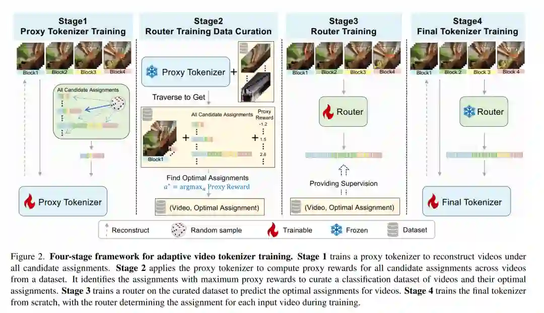 摘要——自回归(AR)视频生成模型依赖于视频标记器将像素压缩为离散标记序列。这些标记序列的长度对于平衡重建质量与下游生成的计算成本至关重要。传统的视频标记器在不同视频的时域块上采用均匀的标记分配方案,这往往导致在简单、静态或重复的片段上浪费标记,而对动态或复杂片段的采样则显不足。为了解决这一低效问题,我们引入了 EVATok,这是一个用于构建**高效视频自适应标记器(Efficient Video Adaptive Tokenizers)**的框架。我们的框架首先估计每个视频的最优标记分配方案,以实现最佳的质量-成本权衡;随后开发了轻量级路由器以快速预测这些最优分配;并训练自适应标记器根据路由器预测的分配方案对视频进行编码。我们证明了 EVATok 在视频重建及下游自回归生成任务中,均能显著提升效率与整体质量。得益于整合了视频语义编码器的高级训练方案,EVATok 在 UCF-101 数据集上实现了卓越的重建效果和最先进的(SOTA)类别到视频生成表现。与先前的 SOTA 模型 LARP 以及我们的固定长度基准模型相比,EVATok 节省了至少 24.4% 的平均标记使用量。