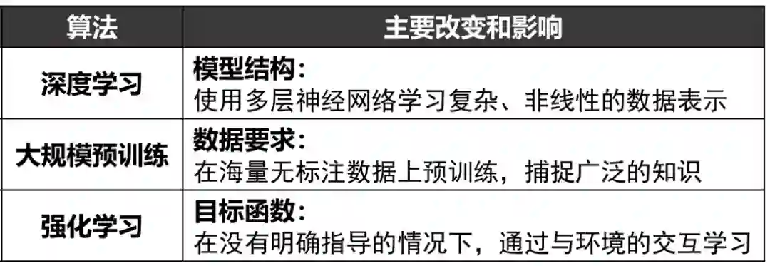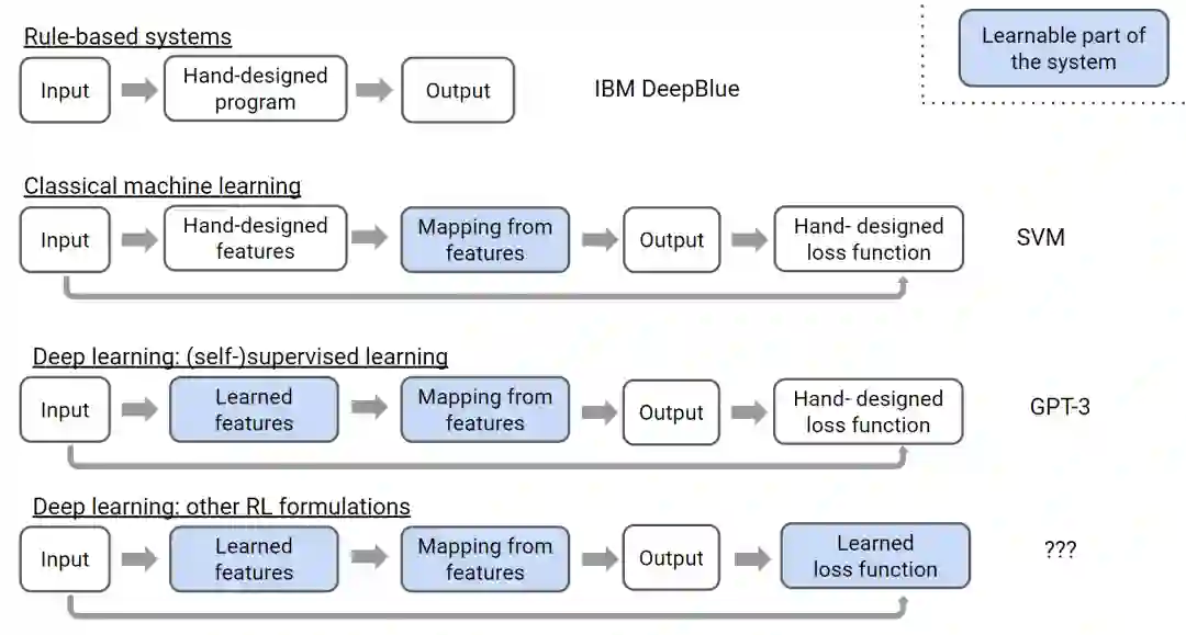 OpenAI研究员Hyung Won Chung从手工设计和自动学习模块的变化角度,总结了人工智能从专家系统、传统机器学习、深度(监督)学习到深度强化学习的发展历程[20]。在传统机器学习和深度学习中,目标函数需要通过手工设计,重点在于学习特征表示和特征到目标的映射。而强化学习将目标函数也作为可学习的模块,可以解决那些难以直接定义目标的任务。