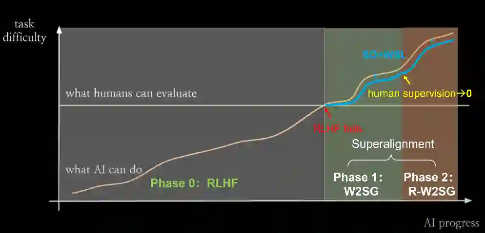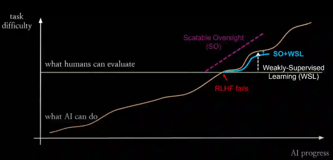 目前实现价值对齐的主流方法是RLHF。当人类评估者可以提供高质量的反馈信号时,RLHF非常有效。但在AI能力进化的时间尺度上,人类的评估能力是相对固定的。从某一个临界点开始,人类将无法再为对齐AI系统提高有效的反馈信号。超级对齐的核心问题是在这种情况发生时如何让弱监督者控制比他们聪明得多的模型。 OpenAI超级对齐团队提出的弱到强泛化(Weak-to-Strong Generalization, W2SG)框架[18]为超级对齐提供了新的解决思路,通过用弱老师模型模拟人类监督者、强学生模型模拟超过人类的被监督者,让超级对齐的实证研究成为可能。可扩展监督(Scalable Oversight, SO)致力于增强监督系统,结合可扩展监督可以减少弱监督和强学生之间的能力差距,更好地挖掘弱到强泛化框架的潜力 [19]。进一步,弱监督学习与弱到强泛化有类似的问题设置:如何更好地利用不完整和有缺陷的监督信号。因此,在弱到强泛化框架下融合可扩展监督和弱监督学习,分别从增强监督信号和优化对监督信号的利用两个角度来激发更强大模型的能力。