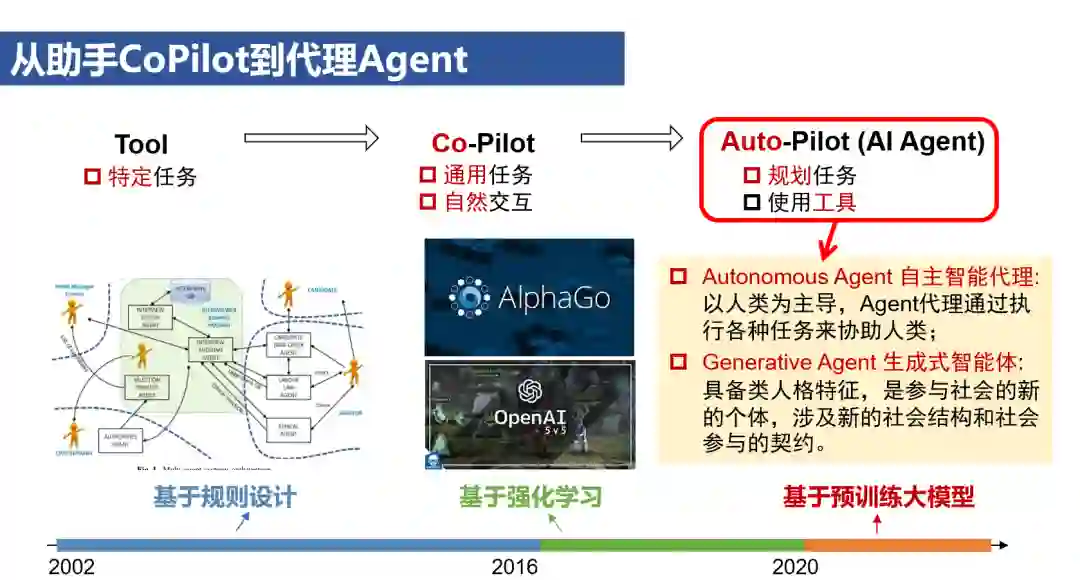 预训练大模型的通用性不仅体现在内容理解和生成上,还扩展到了思考和决策能力上。将Jasper、Midjourney等处理通用任务并具有自然交互能力的AI系统定位为CoPilot,具有规划任务和使用工具能力的AI系统则可以被称为AutoPilot,也就是AI Agent。在CoPilot模式下,AI是人类的助手,与人类协同参与到工作流程中;在AI Agent模式下,AI是人类的代理,独立地承担大部分工作,人类只负责设定任务目标和评估结果。 值得注意的是,AI Agent的概念在人工智能的早期就存在,在预训练大模型之前经历了基于规则设计和基于强化学习两个阶段。当前讨论的AI Agent,更准确地说,是基于预训练大模型的AI Agent。相比前两个阶段的AI Agent面向特定任务和场景设计,基于预训练大模型的AI Agent核心特点在于其对通用任务和场景的适应性。 基于预训练大模型的AI Agent AI Agent的主要架构包括Perception感知、Planning规划、Action行动和Memory记忆。在行动环节,AI Agent既可以依托自身的大模型能力,也能调用外部API或其他模型等工具来执行任务。规划过程包含任务分解和基于反馈的持续优化两个方面。任务分解目前主要采用思维链和思维树的方法,这些方法模仿人类的系统二推理过程,通过结构化地组织和细化思维来应对复杂问题。基于反馈的修正则主要通过两种方法实现:一种是ReAct,它将推理与行动结合在单一轮次中,践行了“学(行动)而不思(推理)则罔,思而不学则殆”的原则;另一种是Reflexion,可以看成是一种基于语言的、能够从错误中进行多轮反思的在线强化学习方法。