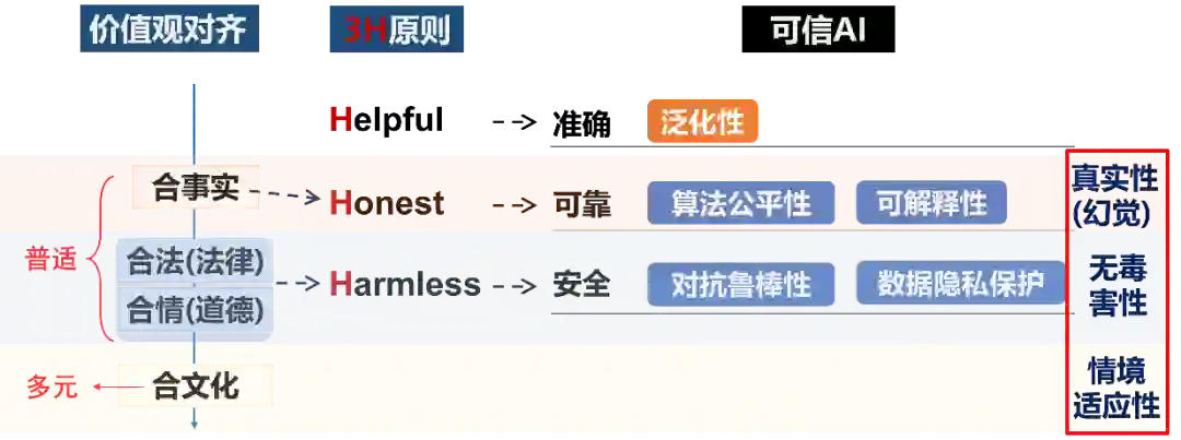到了预训练大模型时代,随着AI能力的持续提升,应用广度和深度都将大幅增加。能力越大,责任越大。人们在享受AI带来的便捷和生产力提升的同时,对AI的态度将从适应逐渐转变为依赖。当人们开始依赖AI代替自己学习、思考、甚至决策时,对AI的可信和价值对齐也提出了更高的要求。除了将经典可信问题的研究对象从专用小模型迁移到预训练大模型上[7,8,9],我们还面临着一系列新的可信和价值对齐问题。 Anthropic提出了人机对齐的“3H原则[10]”:其中Helpful有益对应了能力对齐对于准确性的要求;而Honest诚实和Harmlles无害则大致对应了价值对齐中在可靠性和安全性方面的要求。哈工大秦兵老师提出的框架[11]中从合事实、合法、合情、合文化的维度,设定了普适和多元的价值观对齐目标。相比经典可信AI中的问题,在新的价值对齐框架下,特别是面向生成式AI的特点,真实性[12]、无毒害性[13]、情境适应性[14]等新的价值对齐问题需要给予更多的关注。