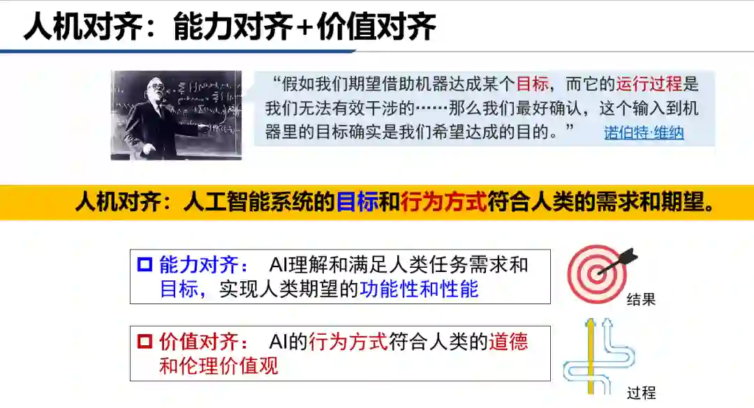 目前,对于AGI实现的标准还没有达成共识。如果将人机对齐视为实现AGI的一种标准,那么在追求目标层面上的能力对齐之外,还要考虑行为方式层面的价值对齐。能力对齐和价值对齐可以类比为结果和过程:就像旅行到达目的地是结果,但采用哪种交通方式、选择哪条路线可以有不同的过程。 人机对齐:能力对齐+价值对齐 *