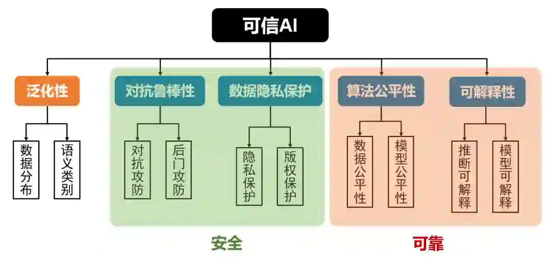 可以发现,价值对齐所要求的对抗鲁棒性[3]、算法公平性[4]、可解释性[5]、数据隐私保护[6] 等问题,正是构成经典可信AI的四个核心维度。而可信AI是建立在泛化性的基础上,这也对应了能力对齐是价值对齐的先决条件。概念上,我们可以将价值对齐看做可信AI的外延,它不仅包含了技术层面的对齐,还涵盖了更广泛的伦理和社会责任。