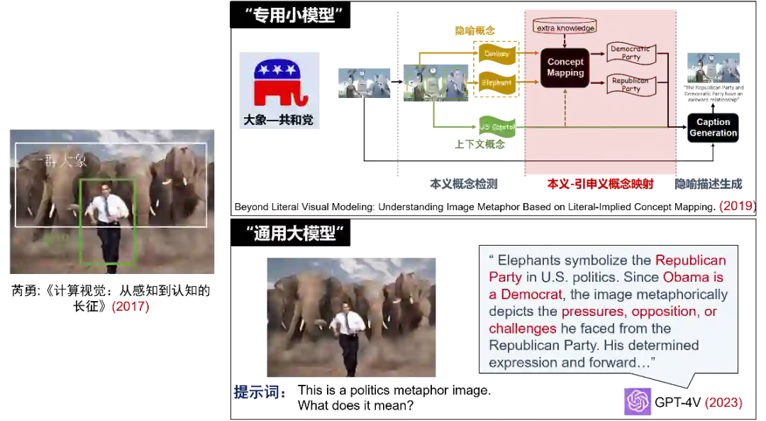 以中英翻译任务为例,知识工程方法需要语言学家来编写规则库,传统机器学习和深度学习基于语料学习概率模型或进行模型微调。这些方法都为特定的机器翻译任务而设计。然而,今天的同一个大语言模型不仅可以翻译几十种语言,还能处理问答、摘要、写作等不同的自然语言理解和生成任务。结合我自己的研究经历,芮勇老师在2017年提出了隐喻图像理解的认知挑战(将”大象”与“共和党”建立联系,从而理解图像对美国政治的讨论)。我们在2019年通过多个专用小模型流水线式(本义概念检测-本义引申义概念映射-隐喻描述生成)的方式尝试进行了解决。而到了2023年,只需要一句简短的提示词,GPT-4V就能非常准确地理解图像背后的政治隐喻含义。