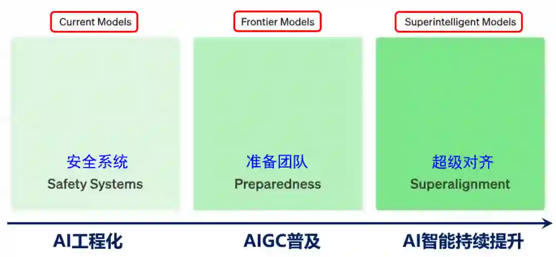 根据不同时间范围,OpenAI设定了3个对齐与安全团队,分别面向当前的前沿模型、过渡阶段模型和未来超级模型。根据这个设定,下面结合我们自己的研究例子讨论大模型时代价值对齐的三个阶段。