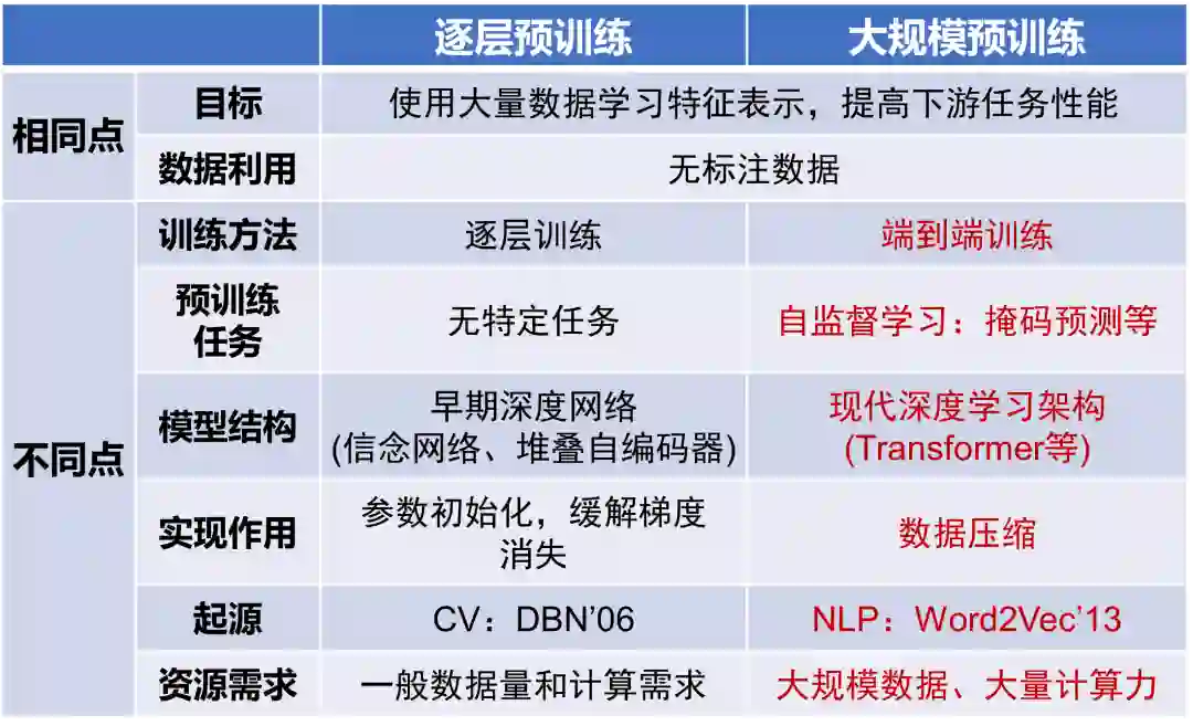 预训练大模型采用的大规模预训练技术与早期深度学习中的逐层预训练技术,虽然都基于无标注数据来学习特征表示,但在训练方法、预训练任务、模型架构、功能实现、起源以及资源需求等方面存在很大差异。从起源来看,逐层预训练技术最初应用于计算机视觉领域,旨在学习图像的视觉特征表示。而大规模预训练技术的起点是自然语言处理领域的语言模型NNLM和Word2Vec。