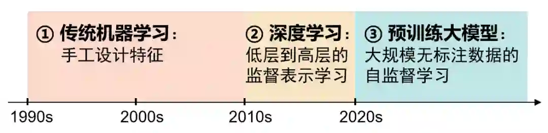 经过30多年的发展,机器学习方法大致经历了三个阶段:1990-2010年依赖手工设计特征的传统机器学习、2010-2020年从低层到高层进行监督表示学习的(传统)深度学习,以及2020年以后基于大规模无标注数据进行自监督学习的预训练大模型。围绕以预训练大模型为中心的第三代机器学习,下面探讨人工智能发展的三个趋势和对未来的四点展望。