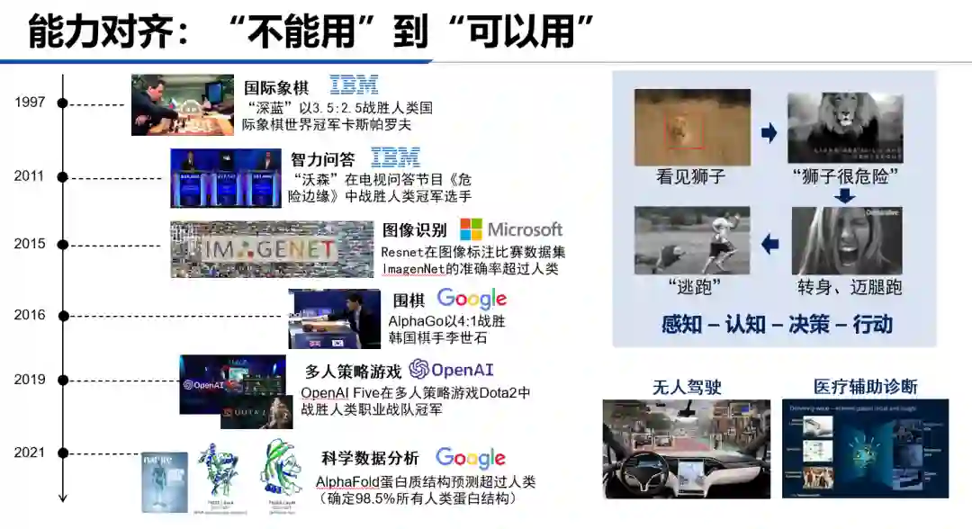 从人工智能的定义可以看出其与人类对齐的初衷。无论是基于逻辑演绎的知识工程方法,还是基于归纳总结的统计机器学习方法,目的都是与人类的对齐。以机器学习方法为例,监督学习范式下,人类标注训练数据集(X,Y),模型学习从输入X到输出Y的映射f(),这一过程可以看成一种类人知识蒸馏;无监督和自监督范式下,由人类定义的相似度度量和代理任务(比如生成式代理任务旨在重构人类语言或自然图像)也在向模型传递人类的知识。通过将训练目标函数和人类对齐,模型在一系列代表人类不同能力的任务上相继通过了图灵测试,这在一定程度上实现了与人类的能力对齐。