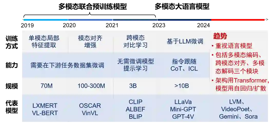 尽管在过去的一年里,大语言模型的成功促使很多多模态模型选择在已有的大语言模型基础上进行视觉和语音编码器的微调,但从长远来看,多模态大模型的发展倾向于从头联合预训练多种模态数据。虽然语言是人类智能区别其他动物的关键,但从人类大脑的进化过程看,语言能力是在大概50万年才开始发展的。人类视觉系统的进化经历了几亿年的时间,早在语言能力形成前就完成了。此外,教育学的经验也告诉我们,协调多模态感知有助于孩子的智力发育。 目前,我们已经看到一些模型,如Gemini,重新采用了联合预训练的方法。同时,许多人预测,下一代的多模态大模型,如GPT-5,尤其是当加入视频生成能力后,将更可能采用统一的联合预训练方法。联合预训练能够从底层更全面地理解和整合来自不同模态的信息,建立更深层次的联系和协同。 *