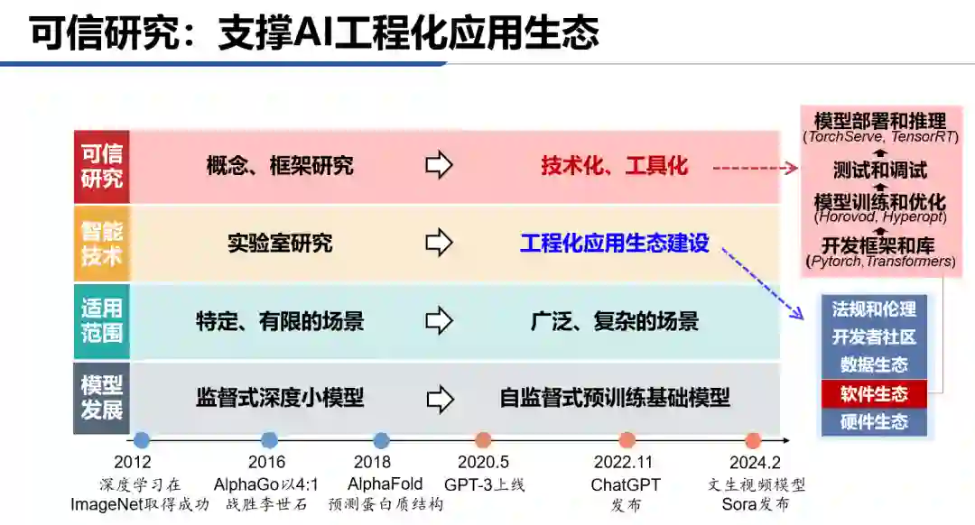 应用生态建设是技术走向成熟的标志。以软件科学向软件工程的发展为例,通过建立测试环境、工具链、开发平台等基础设施,完善软件构建、部署和维护等DevOps关键环节,形成了一个完整的软件开发周期。AI的工程化应用生态建设涉及对整个智能生命周期进行管理。其中的软件生态AIOps/LMOps通过提供必要的工具和服务,以确保模型开发、测试、部署和运维的高效与稳定。可信和价值对齐的研究需要深入到AI应用生态的构建和实施中,从概念和框架研究转向更加实际的技术实践,并将解决方案以工具和集成模块的形式支撑模型研发和应用开发人员。