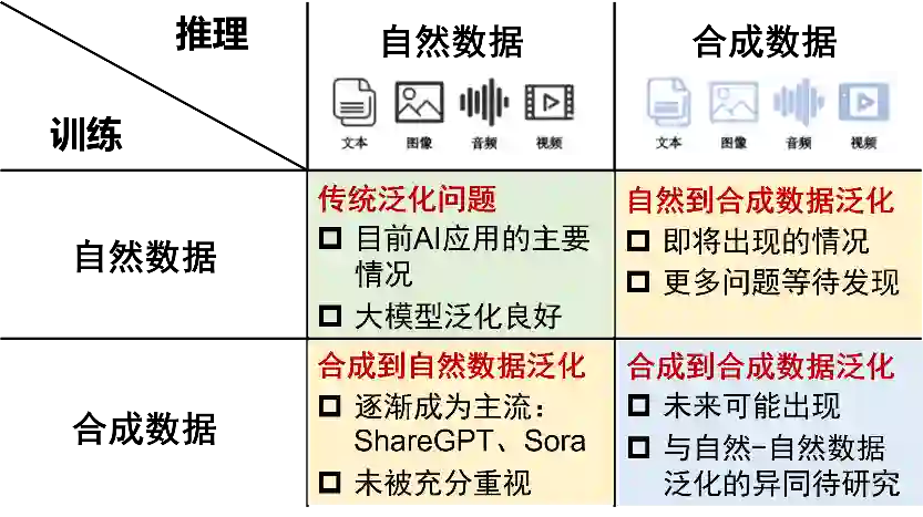 情况2和3可以被视为广义的OOD问题,可以称之为“自然数据与合成数据的OOD”(Natural-Synthetic OOD)。实际上,即使是情况4,也应该考虑以某种方式混合自然数据和合成数据进行模型训练。深入理解自然数据和合成数据的差异,除了应用于鉴别真伪,对未来有效地使用合成数据训练、以及在应用中与合成数据进行交互也非常重要。