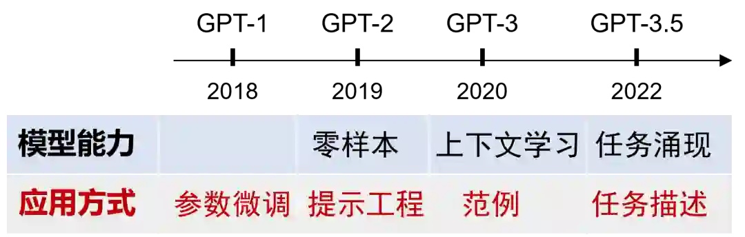 根据Leslie Valiant的观点[1],大规模预训练可以类比生物神经网络通过亿万年数据积累所形成的先天结构先验,即群体基因或生理进化。预训练模型的应用,则类似于个体在后天面对小数据进行的微调。沿着GPT系列的发展,我们可以清晰地看到预训练模型能力和对应的应用方式的变化:从GPT-1的预训练模型参数微调(全量微调/参数高效微调)、GPT-2展现零样本能力后的提示工程、GPT-3展现上下文学习能力后的范例设计、以及到GPT-3.5任务涌现后直接通过任务描述来引导模型。OpenAI的成功很大程度来源于其领先的认知和始终如一的坚持:通过增加数据和模型规模推动智能向更加通用的方向发展。 预训练模型应用方式的演变 从专用模型到通用模型的转变,带来了如下四个方面的具体变化:
