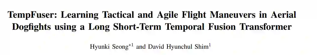 在空战中,斗狗提出了错综复杂的挑战,需要同时了解战略机动和敏捷战斗机的空中动态。在本文中,我们介绍了一种新颖的长短时间融合变换器 TempFuser,该变换器旨在学习空中斗狗中的战术和敏捷飞行动作。我们的方法采用两种不同的基于 LSTM 的输入嵌入来编码长期稀疏和短期密集状态表征。通过变压器编码器对这些嵌入进行整合,我们的模型捕捉到了战斗机的战术和灵活性,使其能够生成端到端的飞行指令,从而确保优势位置并超越对手。在高保真飞行模拟器中与各种类型的对手飞机进行广泛训练后,我们的模型成功地学会了执行复杂的战斗机机动动作,性能始终优于几个基线模型。值得注意的是,我们的模型即使在面对具有超强规格的对手时,也能表现出类似人类的战略机动能力,而这一切都无需依赖明确的先验知识。此外,它还在极具挑战性的超音速和低空环境中表现出强大的追击性能。演示视频请访问 https://sites.google.com/view/tempfuser。