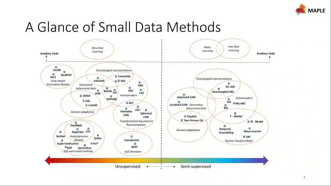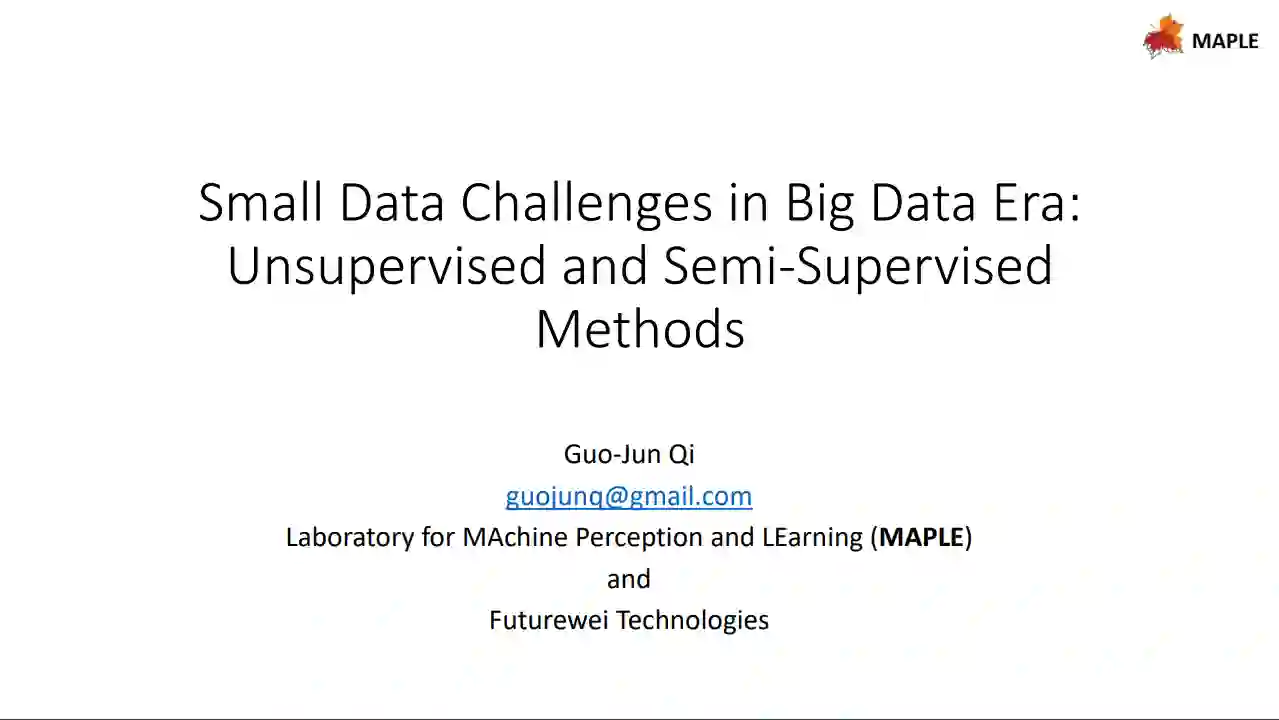 小数据挑战已经在许多学习问题中出现,因为深度神经网络的成功通常依赖于大量标记数据的可用性,而这些数据收集起来很昂贵。为了解决这些挑战,以无监督和半监督的方式训练带有小数据的复杂模型方面已经做出了很多努力。在本教程中,我们将回顾这两种主要方法的最新进展。各种各样的小型数据模型将被概括为一幅大图,在这里我们将展示它们如何相互作用。具体来说,我们将回顾学习变换等,自我监督和半监督表示形式的标准,这些标准为最近的发展奠定了基础。