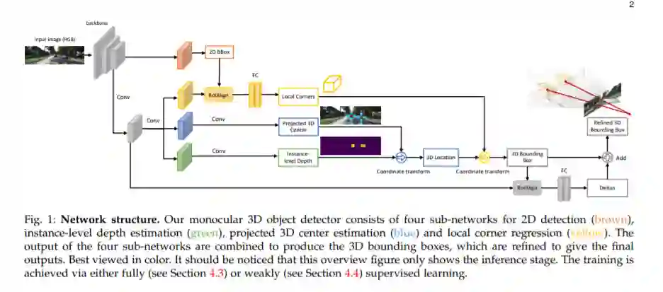 本文将单目3D目标检测任务分解为四个子任务,包括2D目标检测,实例级深度估计,投影3D中心估计和局部角点回归。