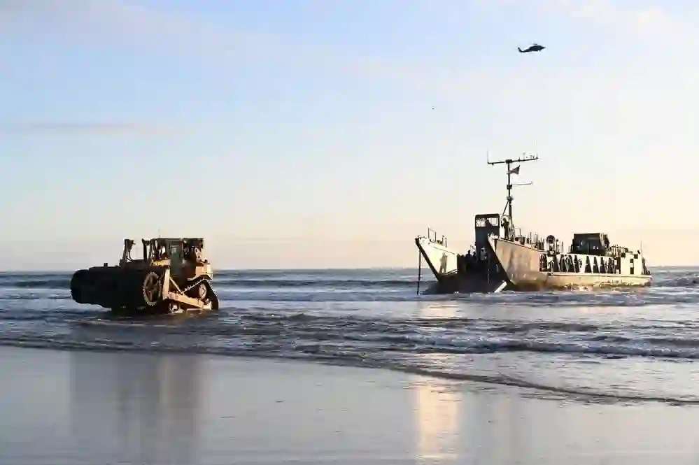 图:2024 年 2 月 29 日,在美国陆军未来司令部主办的"项目融合-顶点4"活动期间,分配到 i 号海滩管理单元和两栖建设营的美国海军水兵在加利福尼亚州彭德尔顿营卸载设备。