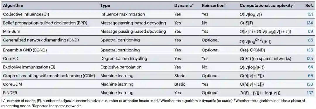 为了更有效地瓦解或保护网络,研究者们开发了一系列针对目标攻击的算法,这些算法的目的是找到网络中哪些节点的移除会最大程度地破坏网络的连通性,从而揭示网络的脆弱点。论文总结了部分主要算法,包括集体影响力(CI),基于信息传播的置信传播消减(BPD, Belief propagation-guided decimation)算法、最小和(Min-Sum)算法,基于谱划分的广义网络拆除(GND)、集合GND(EGND)算法,基于度的CoreHD算法,基于渗流的爆炸性免疫(EI)和基于有监督学习的图形拆除(GDM)(见图2)和基于强化学习的FINDER等。其中,基于机器学习的算法使用几何深度学习,特别是图神经网络来学习在小型合成网络上的攻击策略从而瓦解大型真实网络,它们显示了不同方法在特定应用中的效果和适用范围。 表1 针对目标攻击的主要算法的总结