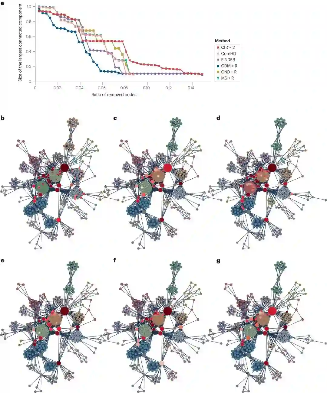 图2:最先进的网络拆解方法比较**,**展示了不同算法如何驱使一个系统(巴西腐败网络,共309个节点)向着解体方向发展,这是通过最大连通分量的相对大小来衡量的。不同曲线显示了各种算法的解体路径。节点颜色代表攻击顺序(灰色节点未被移除),节点大小代表其介数值。攻击后剩余节点的轮廓颜色代表它们所属的群集。