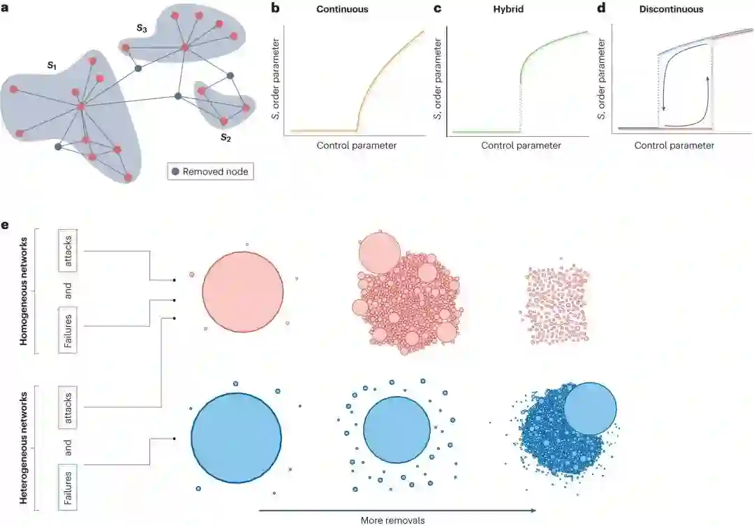 复杂网络广泛存在于我们的世界中,从细胞到人类大脑,从社会群体到互联网,都是由许多互相连接的部分组成的复杂系统。这些系统的宏观特性无法从微观成分中简单推导出来。正是这种网络的互连性,使得它们在面对内部故障和外部干扰时可能会出现严重的退化甚至出现系统性崩溃。例如,电力系统中最初局部过载导致的级联故障,以及推动生态系统走向灭绝的临界慢化现象。 这篇综述介绍复杂网络鲁棒性和韧性的理论和计算方法,讨论了最新用于减轻扰动影响的方法,包括设计鲁棒性、识别预警信号和调整响应。在应用方面,作者还比较了最前沿的网络拆解方法的性能,从而得出这些算法在实际问题中的最佳适用范围,并提供了一个代码库,作为一个评估网络韧性的工具集。