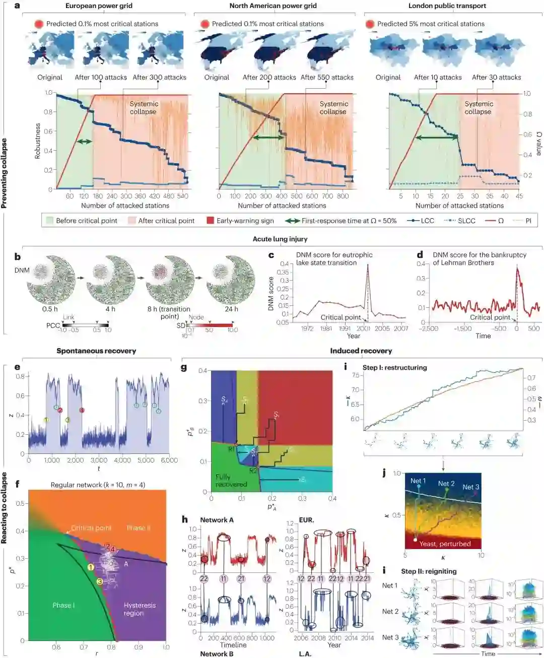 图4:展示了复杂网络在面临崩溃时的预防和应对策略。这包括了早期警告信号的识别、动态网络标记(DNM)的应用来监测临界相变,以及网络行为的模拟分析。论文通过这些示例,展示了在不同类型的网络(如电力网、生物分子网络、金融市场)中,如何有效地监测和应对网络状态的变化。此外,它还探讨了最优修复策略,以及在网络出现问题时如何进行有效的重组和恢复。这些内容反映了论文在理解和管理复杂网络鲁棒性与韧性方面的综合方法。