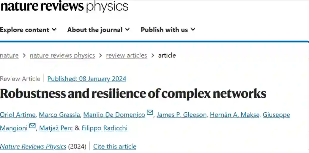 论文题目:Robustness and resilience of complex networks论文期刊:Nature Reviews Physics论文地址:https://www.nature.com/articles/s42254-023-00676-y斑图地址:https://pattern.swarma.org/paper/0022c4f0-ae7a-11ee-bc79-0242ac17000e