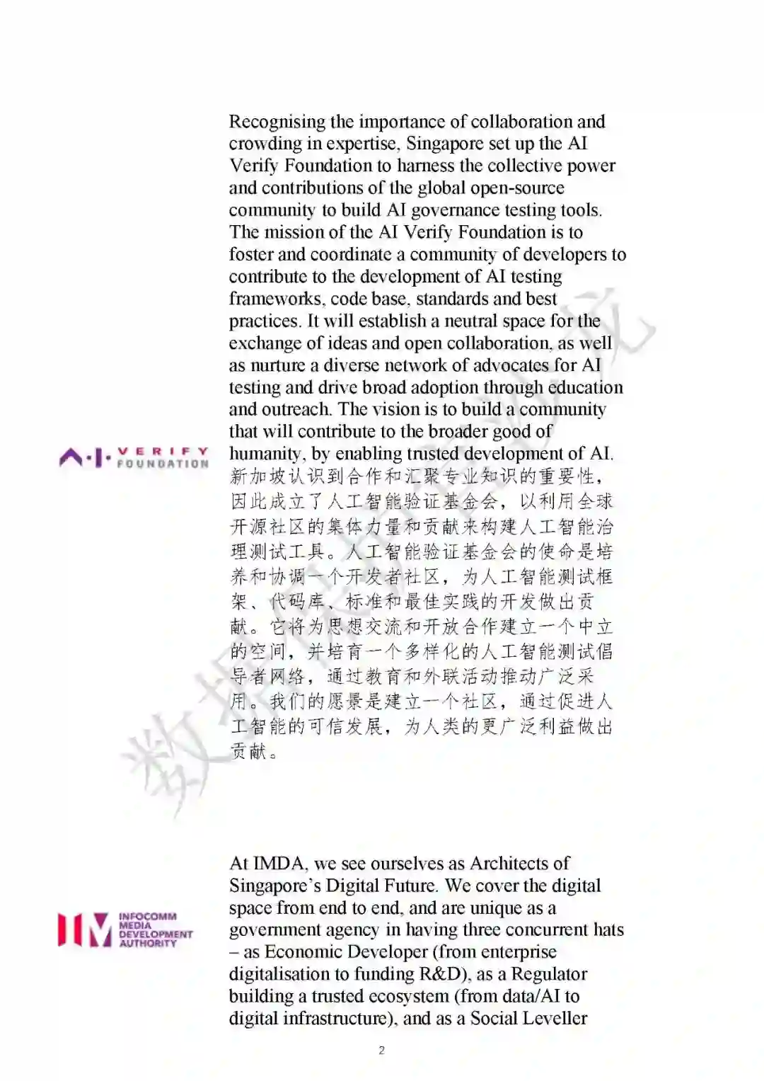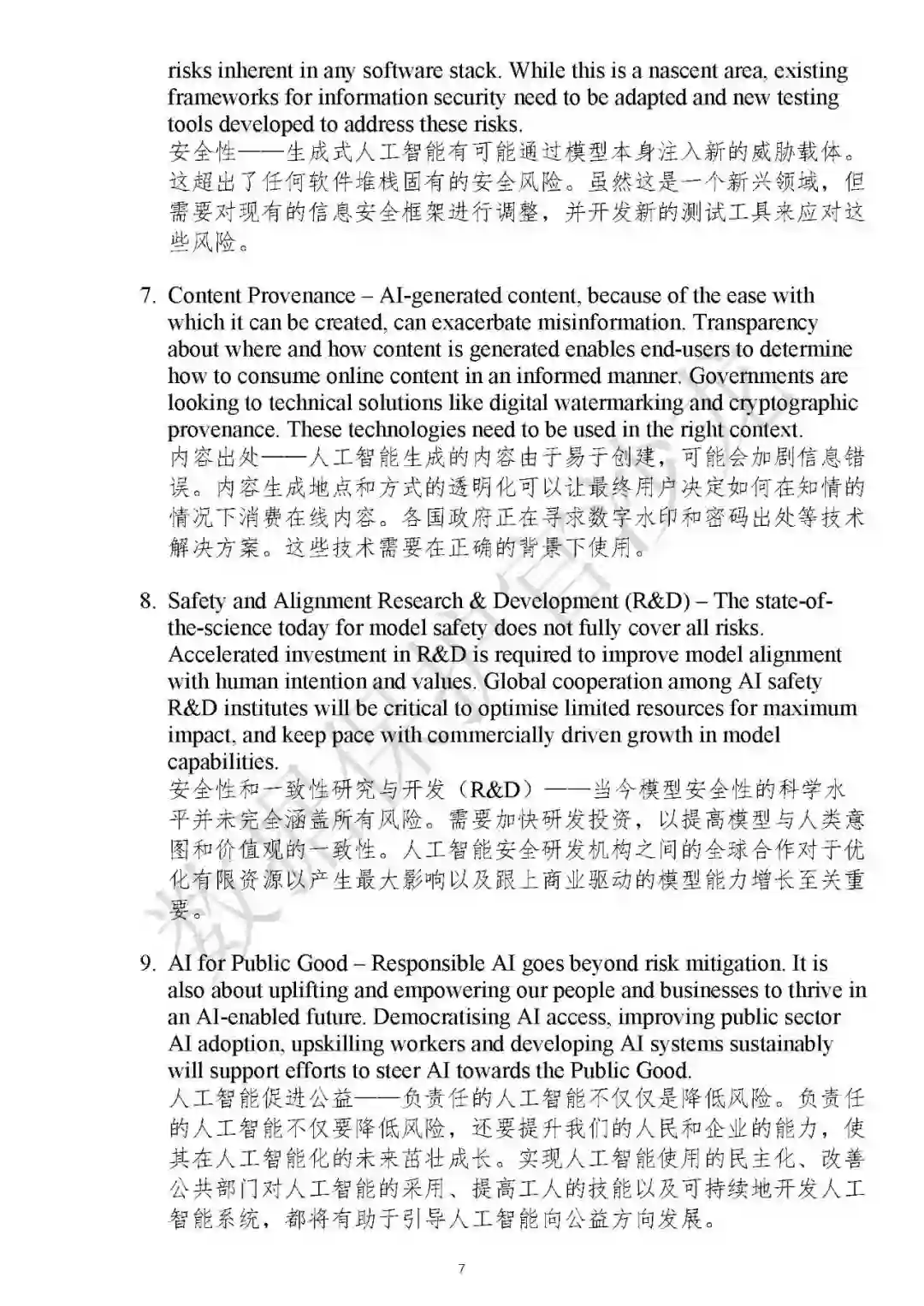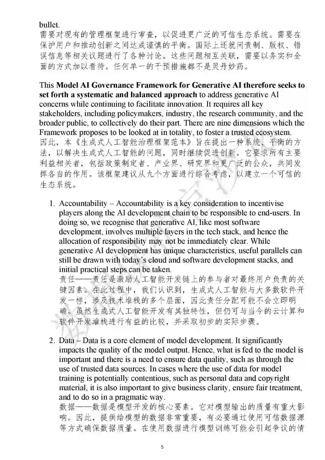 2024年1月16日,新加坡AI Verify基金会(AIVF)和新加坡信息通信媒体发展局(IMDA)共同制定了《生成式人工智能治理的模型人工智能治理框架草案》(Proposed Model AI Governance Framework for Generative AI),以培育可信的生成式人工智能生态系统。该框架在现有涵盖传统AI的2020年人工智能模型治理框架基础上,进一步扩展了模型治理框架,推动了关于生成式人工智能治理的国际共识。