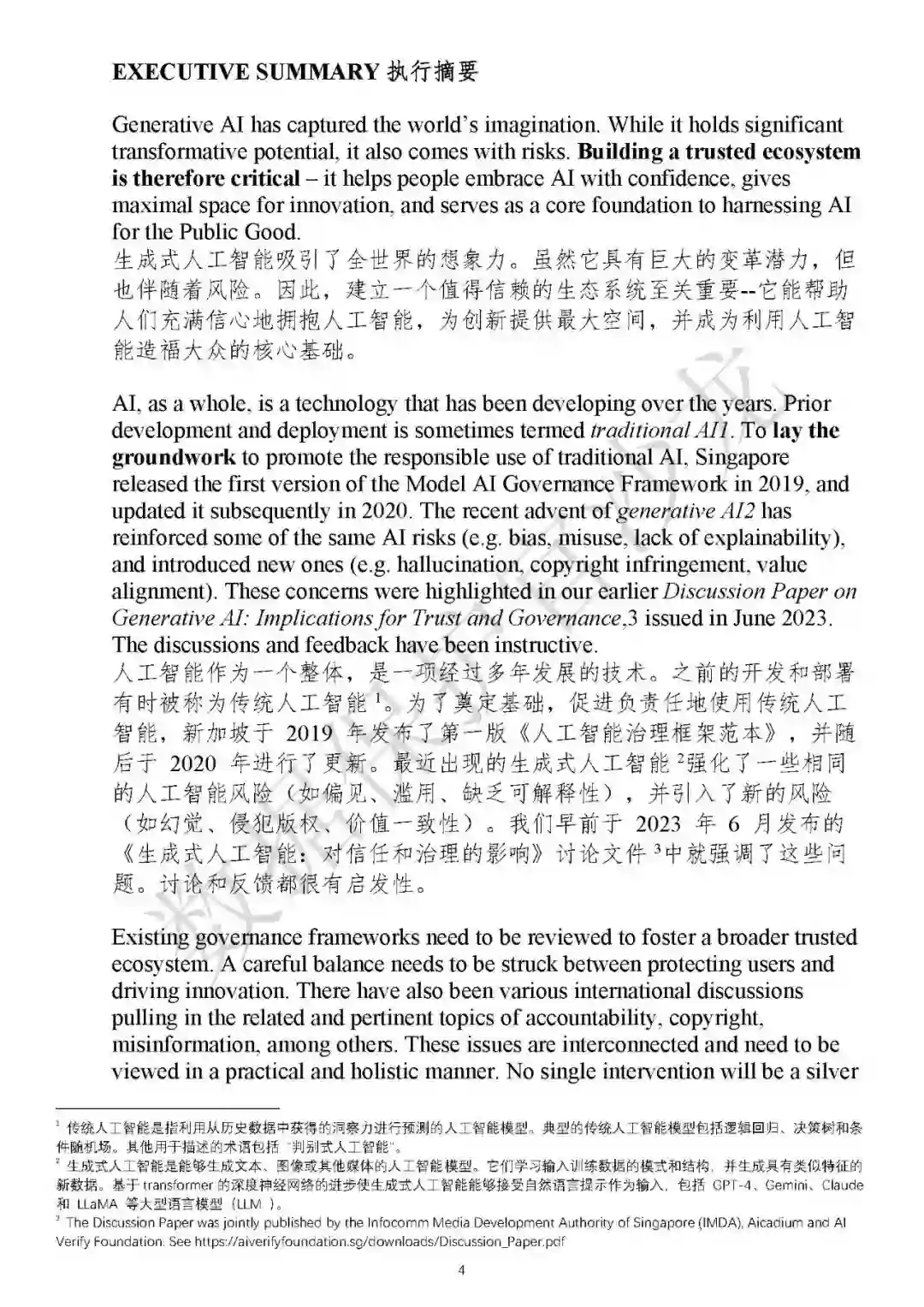 生成式人工智能的变革潜力已显著超越传统人工智能。传统人工智能是指利用从历史数据中得出的见解进行预测的人工智能模型。典型的传统人工智能模型包括逻辑回归、决策树和条件随机场等。生成式人工智能是指能够生成文本、图像或其他媒体的人工智能模型。它们学习输入训练数据的模式和结构,并生成具有类似特征的新数据。生成式人工智能能够接受自然语言提示作为输入,包括GPT-4、Gemini、Claude和LLaMA等大型语言模型(LLM)。为了促进传统人工智能的负责任使用,新加坡于2019年发布了第一版AI治理框架,并在2020年进行了更新。然而,生成式人工智能的发展不仅加剧了传统人工智能相关风险(例如偏见、滥用、缺乏可解释性等),还引入了新的风险(例如误导、侵犯版权、价值取向问题等)。针对生成式人工智能引发的新问题,有必要更新早期的模型治理框架,以全面解决新出现的问题。新加坡于2023年6月发布讨论文件《生成式人工智能:对信任和治理的影响》,对现有的框架进行审查,广泛听取政策制定者、产业界、人工智能行业组织、研究社群和公众等多利益相关方意见。2024年1月16日,新加坡发布《生成式人工智能治理的模型人工智能治理框架草案》(以下简称框架草案),框架草案对讨论文件中提出的概念以及相关反馈意见和建议进行了整合,以在保护用户和推动创新之间取得谨慎的平衡,促进更广泛的可信生态系统。此外,新加坡成立AI verify基金会,构建AI 治理测试工具,如进行AI 测试框架、代码库、标准和最佳实践的开发和研究等,培育多元化的人工智能测试倡导者网络,并通过教育和推广推动广泛采用。 二、关于支持可信人工智能生态系统的九个提议
