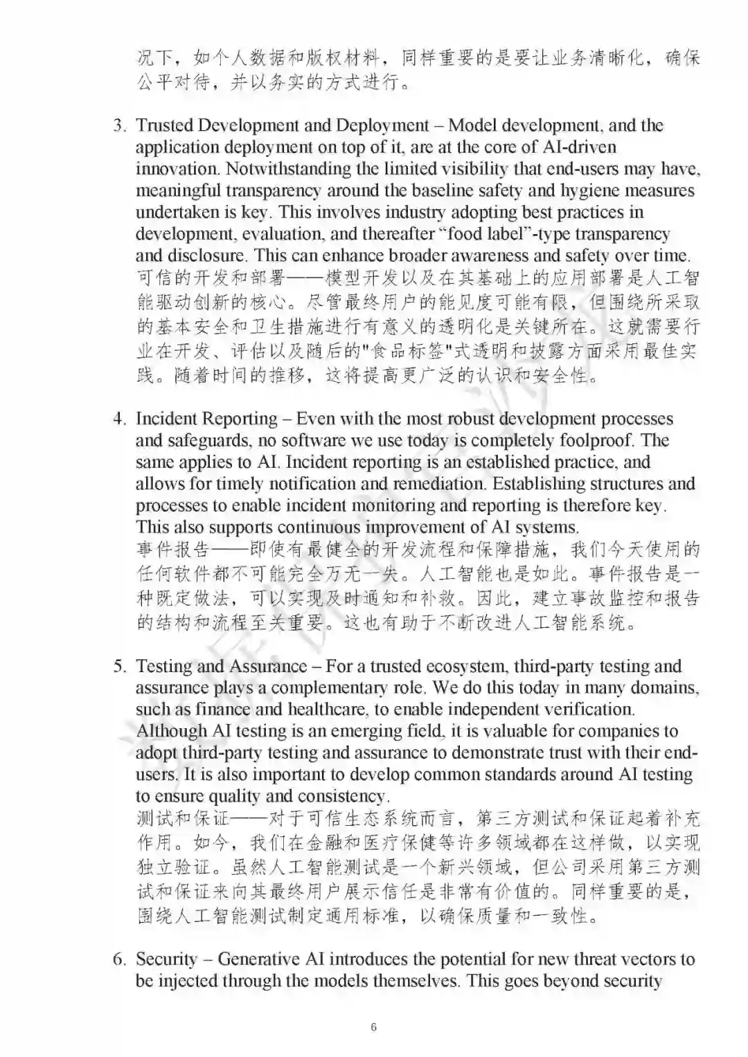 模型开发及在其上进行的应用程序部署是人工智能驱动创新的核心。尽管最终用户对其了解程度可能有限,但有关基本安全措施的透明度是非常关键的。产业界应在开发、评估和披露方面采用最佳实践,例如采取“食品标签”式的透明度管理方式。随着时间的推移,可以提高更广泛的意识和安全性。(四)事件报告