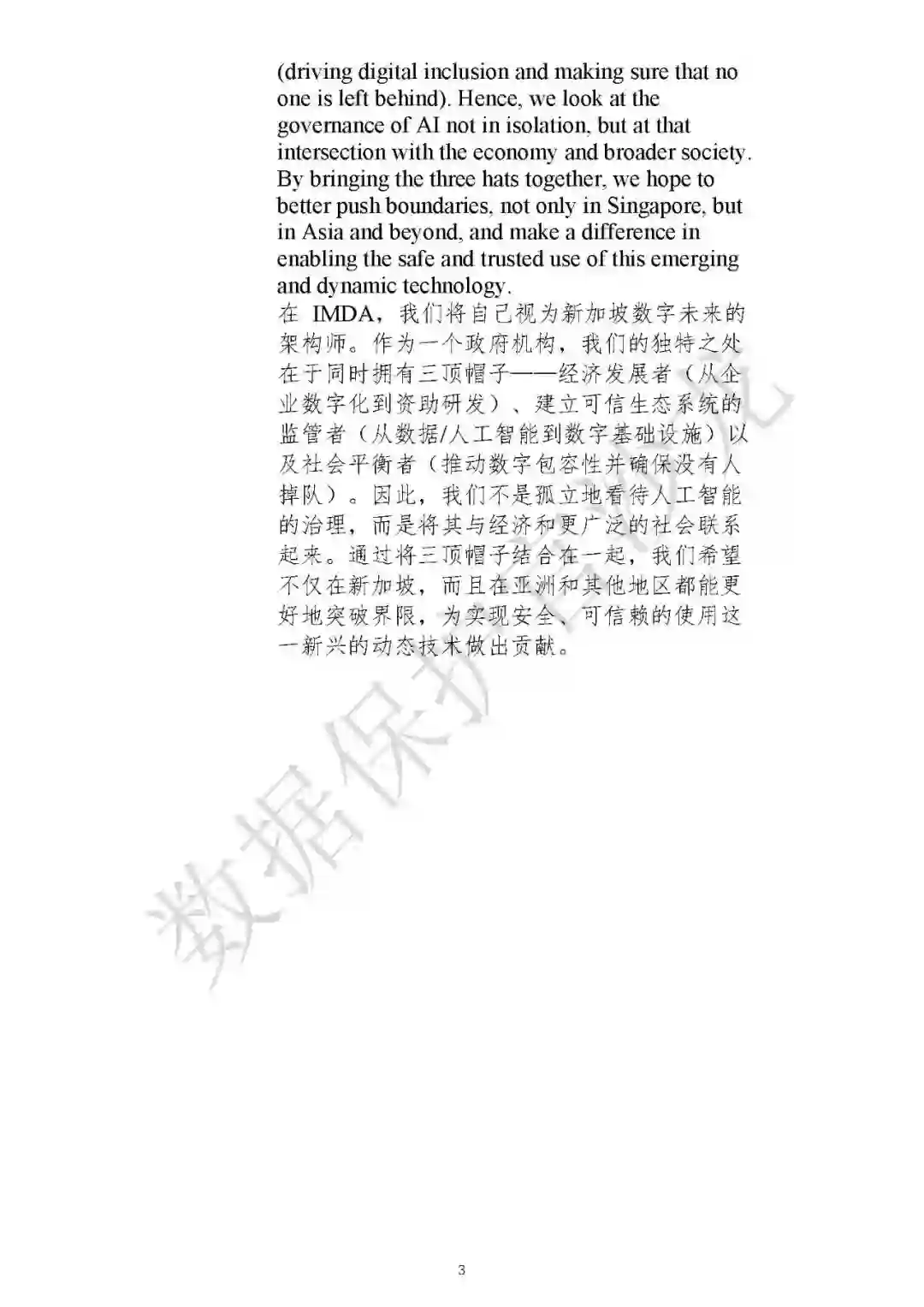 人工智能治理仍处于初级阶段。进行国际合作、建立国际共识是进行人工智能治理的关键,正如新加坡IMDA在国家人工智能治理框架的制定过程中,与美国国家标准与技术研究院(NIST)进行了合作。该框架将随着技术和技术的发展而不断更新,新加坡将对人工智能模型治理框架进行持续完善和优化,采用实际方法来最大程度地提高信任和创新。新加坡预计在2024年中期正式发布《生成式人工智能治理的模型人工智能治理框架》。 (来源:信通院互联网法律研究中心)