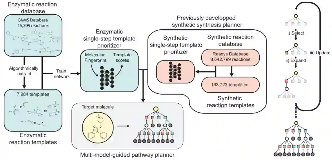 根据化学反应数据训练的合成规划程序可以设计出感兴趣的新分子的有效路线,但它们利用少见的化学转化的能力有限。这一挑战对于酶促反应来说是严峻的,酶促反应由于其选择性和可持续性而很有价值,但数量很少。文章提出了一种逆合成搜索算法,该算法使用两种用于逆合成的神经网络模型平衡了酶促反应和合成反应的探索,以确定混合合成规划。这种方法通过数千种独特的酶促一步转化扩展了逆合成运动的空间,发现了合成或酶促搜索找不到的分子路线,并为其他路线设计了更短的路线。