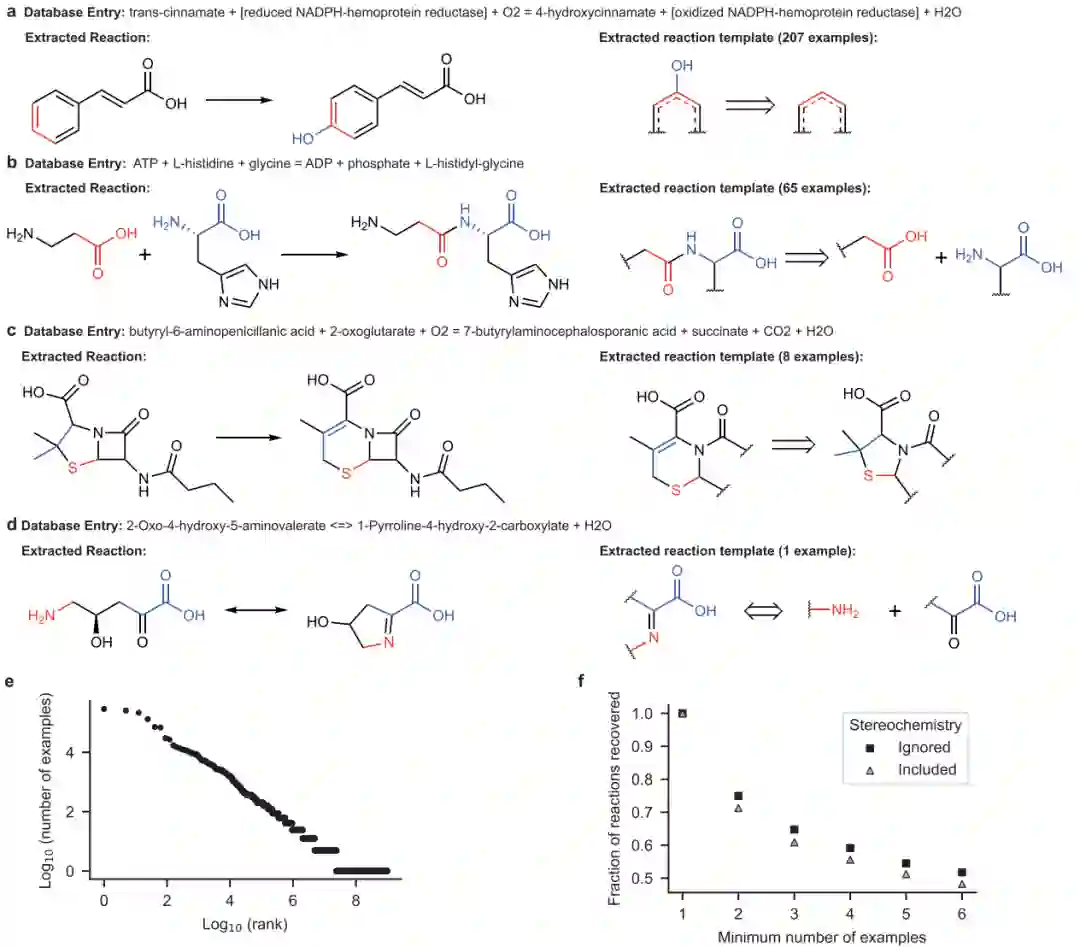 在作者的酶反应数据集中,近80%的反应模板只有一个先例(图2e)。在作者的酶促反应数据集中,近 80%的反应模板只有一个先例(图 2e)。即使稀有反应被分配了更广义的模板且立体化学信息被删除,如方法部分所述,要求提取的模板具有n>1个先例使过滤后的模板集无法描述近20%的数据库中的反应(图2f)。因此,作者没有根据先例的数量删除模板,以最大限度地提高捕获的酶促反应的多样性。