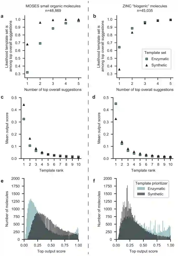 当比较两个模型在不同化学空间上的分数时,会出现一种直观、轻微的偏差。对于有机小分子,顶级逆合成方案更可能是合成的而不是酶促的(图 4c,e)。相反,对于天然产物,顶级逆合成建议更可能是酶促的(图 4d,f)。这种趋势表明,模型显示出一种(合理的)偏差,导致酶化学优先考虑在结构上与天然产物更相似的分子。