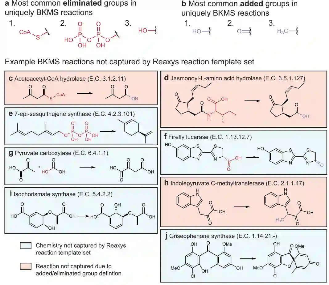 在Reaxys数据集中,在代表硫酯水解的反应规则中,酰基被视为被消除的基团,而保留的产物是硫醇,而在这项工作中,由于作者自动识别常见的生物辅助因子,硫醇被定义为被消除的基团并保留酰基(图3c)。这更符合CoA在生化反应中的作用。消除和添加组的存在混淆了跨数据集的化学转化的自动比较,因为它使得真正独特的化学与数据集准备期间所做选择的结果无法区分(图 3c-h)。