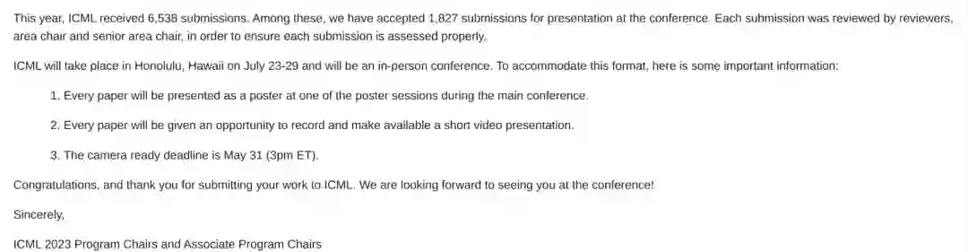 ICML 2023已经公布了会议通知,这是一场备受关注的机器学习盛会。2023年,共有6538份论文提交,通过筛选和评审,有1827篇论文被接收。
