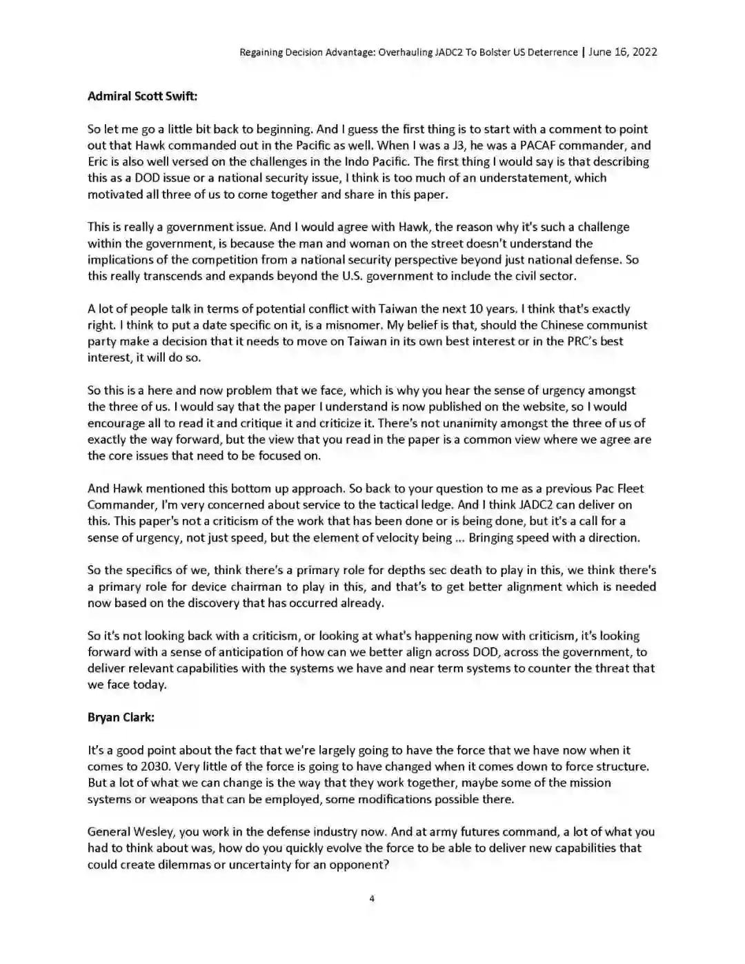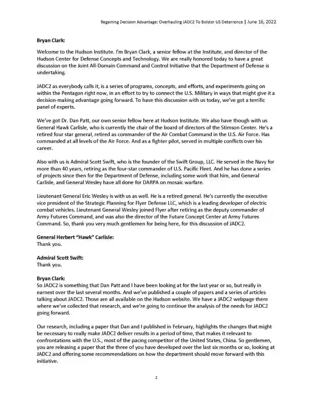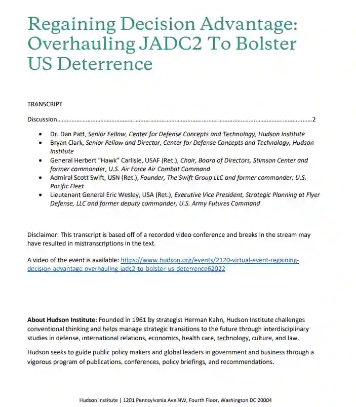 2022年6月15日,美智库哈德逊研究所发布**《重获决策优势:改进联合全域指挥控制以在最佳窗口期实现威慑》**报告,表示单纯的“自上而下”地实施联合全域指挥控制(JADC2)的方式很难在短期内取得成效,美国防部应聚焦印太地区最高优先级的作战挑战,通过高层指导和联邦式的实施方法,快速连接传感器、射手和指挥控制中心,加快实现JADC2,在美军面临最大风险的窗口期内实现对对手的威摄。