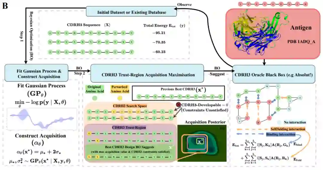 作者在迭代过程中还加入了一种利用置信区域(TR)的可开发性约束方法。具体来说,在每次迭代 t 中,围绕最佳点 定义一个 TR,然后执行 CDRH3-TR采集最大化,接着之前最佳的 开始,接下来,对 的相邻点进行采样。通过选择一个随机氨基酸并用一个新的氨基酸扰动它。如果序列比前一个有所改进,就将他记录下来(如图3 中下部分)。