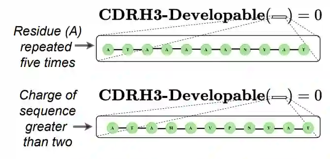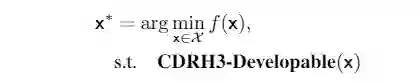其中 CDRH3-Developable(x) 是一个指示函数,它采用氨基酸序列并返回一个布尔值,以确定是否满足可开发性标准(上述三个约束)。该公式表示优化后的序列为满足约束且抗原特异性实值最优。